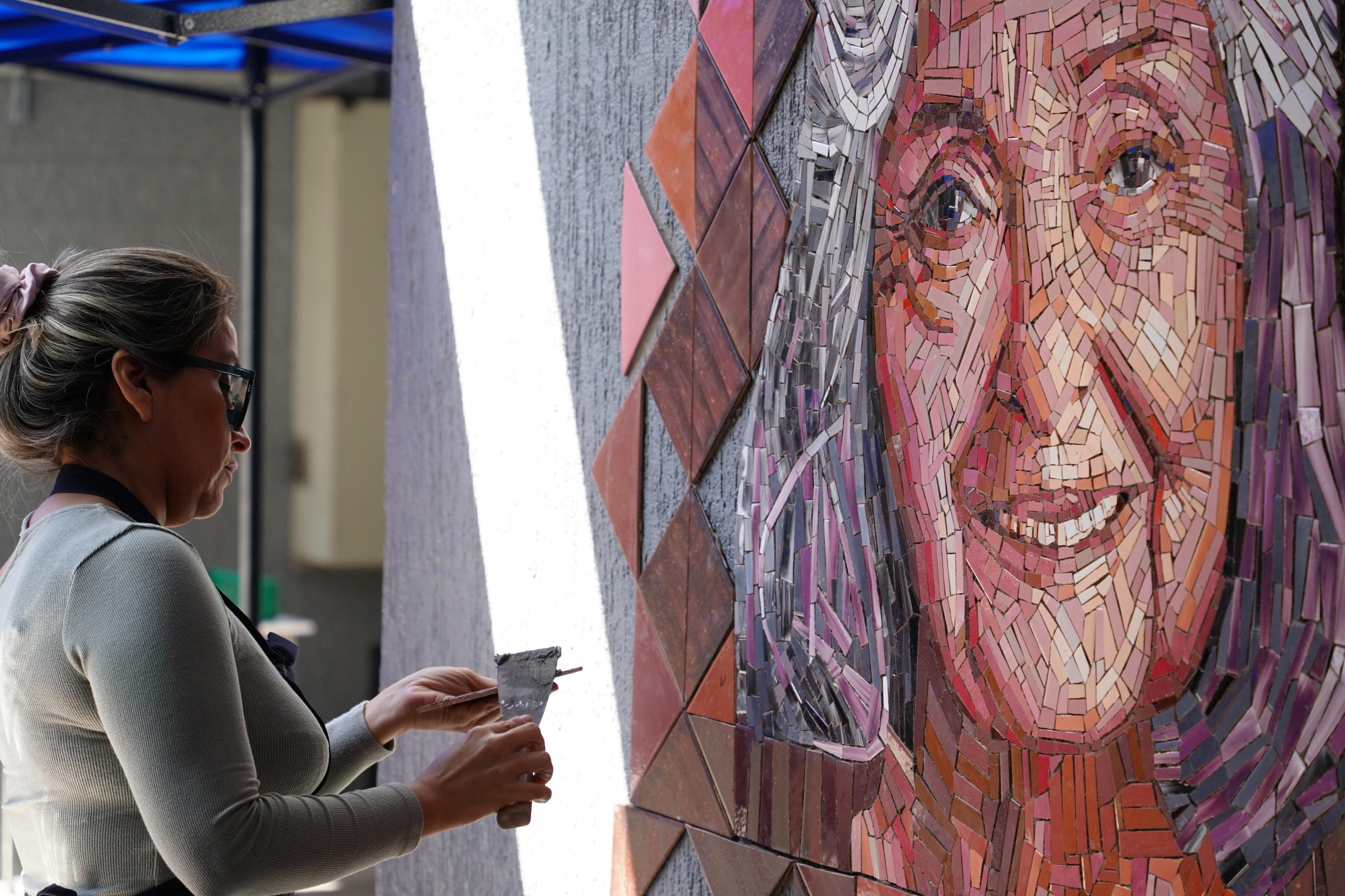 La intervención, elaborada con mosaicos compuestos por azulejos esmaltados y horneados a mil grados, junto a materiales reciclados, buscó transmitir un mensaje donde los fragmentos entrelazados forman una imagen que simboliza cómo las personas y sus historias se conectan en la construcción de un relato colectivo.